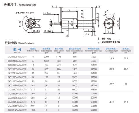 - 外徑 φ22 減速比1/4-1/1296 定格容許扭力(N.m)0.02-0.98