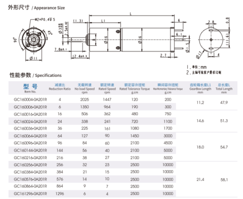 - 外徑 φ16 減速比1/4-1/1296 定格容許扭力(N.m)0.01-0.25