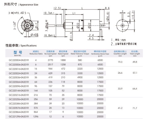 - 外徑 φ22 減速比1/4-1/1296 定格容許扭力(N.m)0.06-0.98