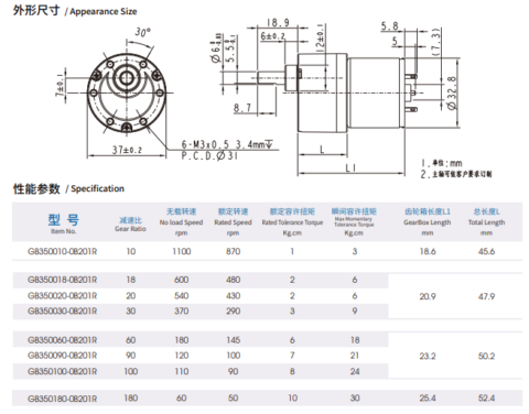 - 外徑φ37 減速比1/10-1/180 定格容許扭力(N.m) 0.1-0.98